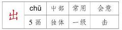 组词: 出版 出差 出产 出动 出发 出击 出境 出口 出路 出卖 出没 出门 出名 出色 出神 出生 出示 出事 出息 出席 出现 出众造句: 【出产】这里出产的瓜果远近闻名。 【出发】我们早上七点半出发。 【出口】这批产品全是要出口的。 【出没】据说,这里经常有野兽出没。 【出色】赛场上,选手们表现得相当出色。 【出示】请大家出示自己的身份证。 【出息】你光知道哭,真没出息。 【出现】经常出现气候反常的现象。 【出众】他出众的才能让人折服。