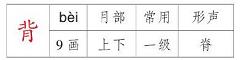 组词: 背后 背景 背离 背面 背叛 背弃 背诵 背心 背影造句: 【背景】这张照片的背景挺好。 【背离】人类不能背离大自然的规律。 【背叛】他从来不会背叛朋友的。 【背诵】我会背诵很多古诗。