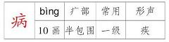 组词: 病房 病害 病假 病菌 病历 病情 病人 病痛 病危 病因造句: 【病房】病房的设施还不错。 【病害】农作物受到了病害的威胁。 【病菌】病菌主要是通过空气传播的。 【病情】我奶奶的病情已经好转了。