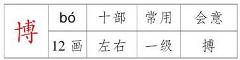 组词: 博爱 博大 博得 博客 博览 博取 博学造句: 【博大】中华武术博大精深。 【博得】精彩的表演博得阵阵掌声。 【博客】在网上写博客的人越来越多。 【博学】张老师是个博学多才的人。