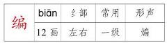 组词: 编导 编号 编辑 编排 编写 编译 编造 编织 编著造句: 【编排】演员们正在编排节目。 【编写】我们编写了这套语文教材。 【编造】不要听信坏人编造的谎言。 【编织】我妈妈会编织毛衣。