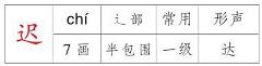 组词: 迟迟 迟到 迟钝 迟缓 迟延 迟疑 迟早造句: 【迟迟】到现在,他还迟迟不到。 【迟缓】你们的动作太迟缓了。 【迟疑】他迟疑了一下,站了起来。 【迟早】这件事大家迟早会知道的。