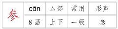 组词: 参股 参观 参加 参见 参军 参考 参赛 参与 参展 参照造句: 【参观】我们昨天参观了科技馆。 【参加】我们要去参加舞蹈比赛了。 【参与】欢迎大家参与这项活动。 【参照】这种做法我们可以参照。